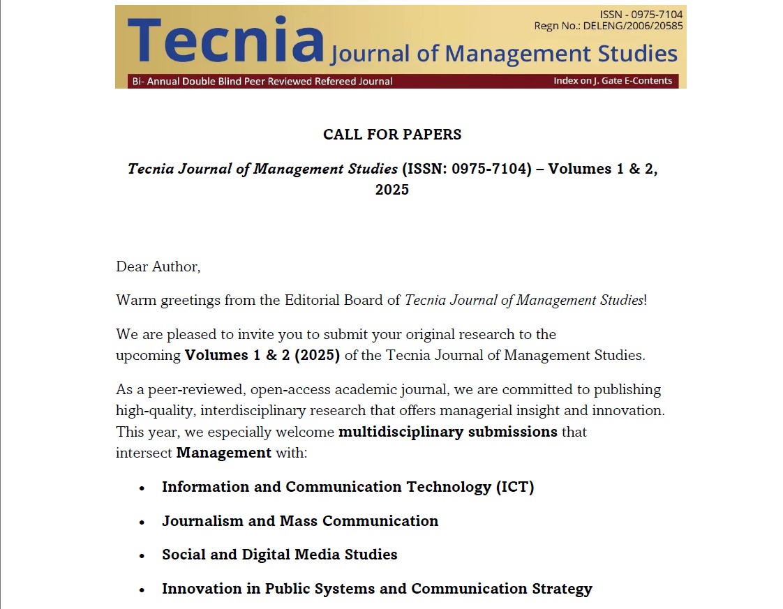 खंड 19 No. 1 (2024): Tecnia Journal of Management Studie, Volume 19